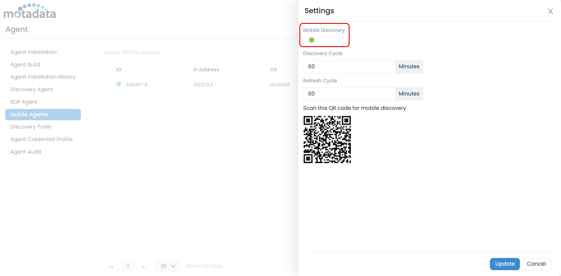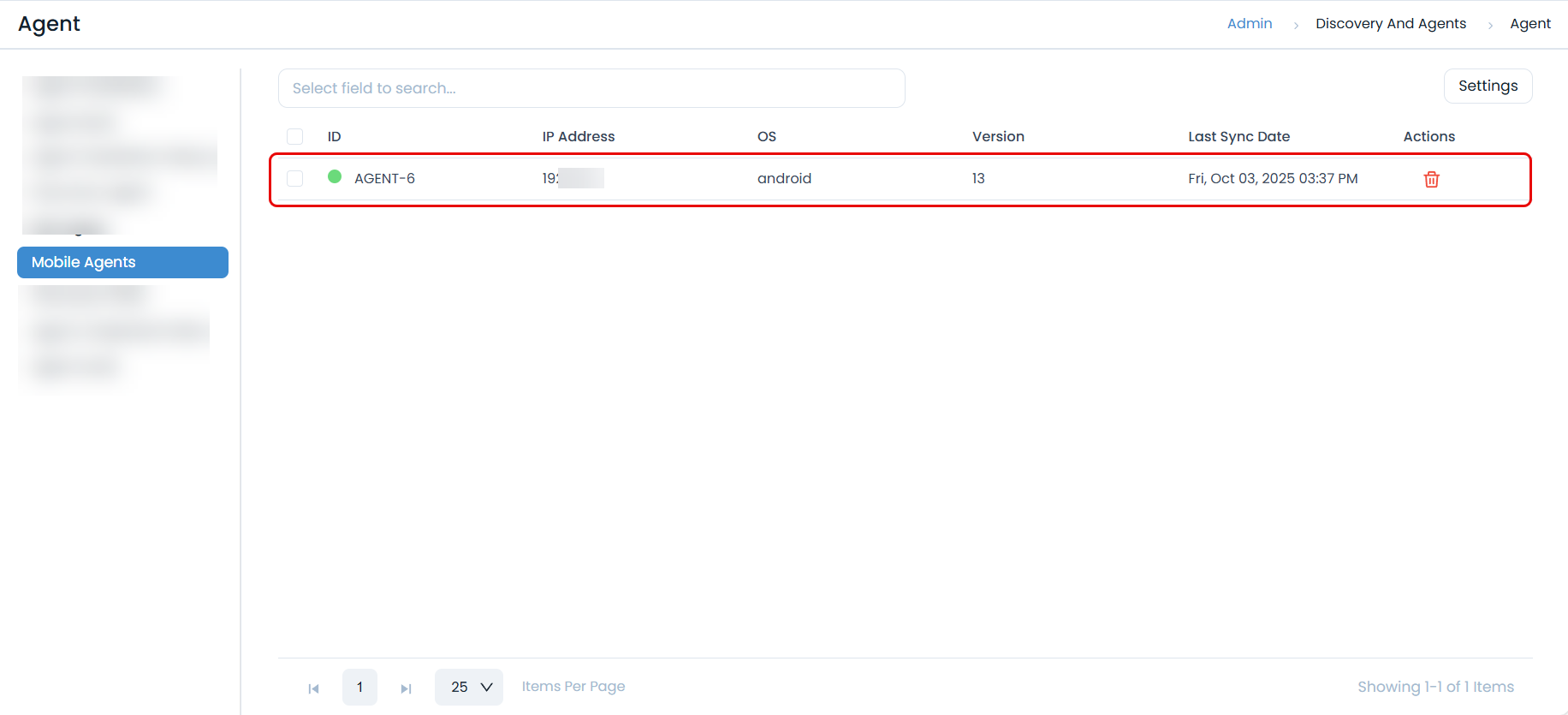 This menu is accessible only when enabled in the settings of the ServiceOps web application. Navigate to Admin > Discovery and Agents > Agent > Mobile Agents tab, as shown below.
