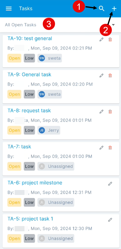 - Filter: You can filter the tasks list by tapping the desired option. For example: If ‘All Open Tasks’ is selected, the grid displays all the tasks with open status.