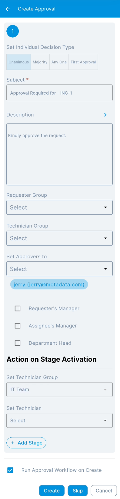- A popup will open to create the approval. Fill in the details.