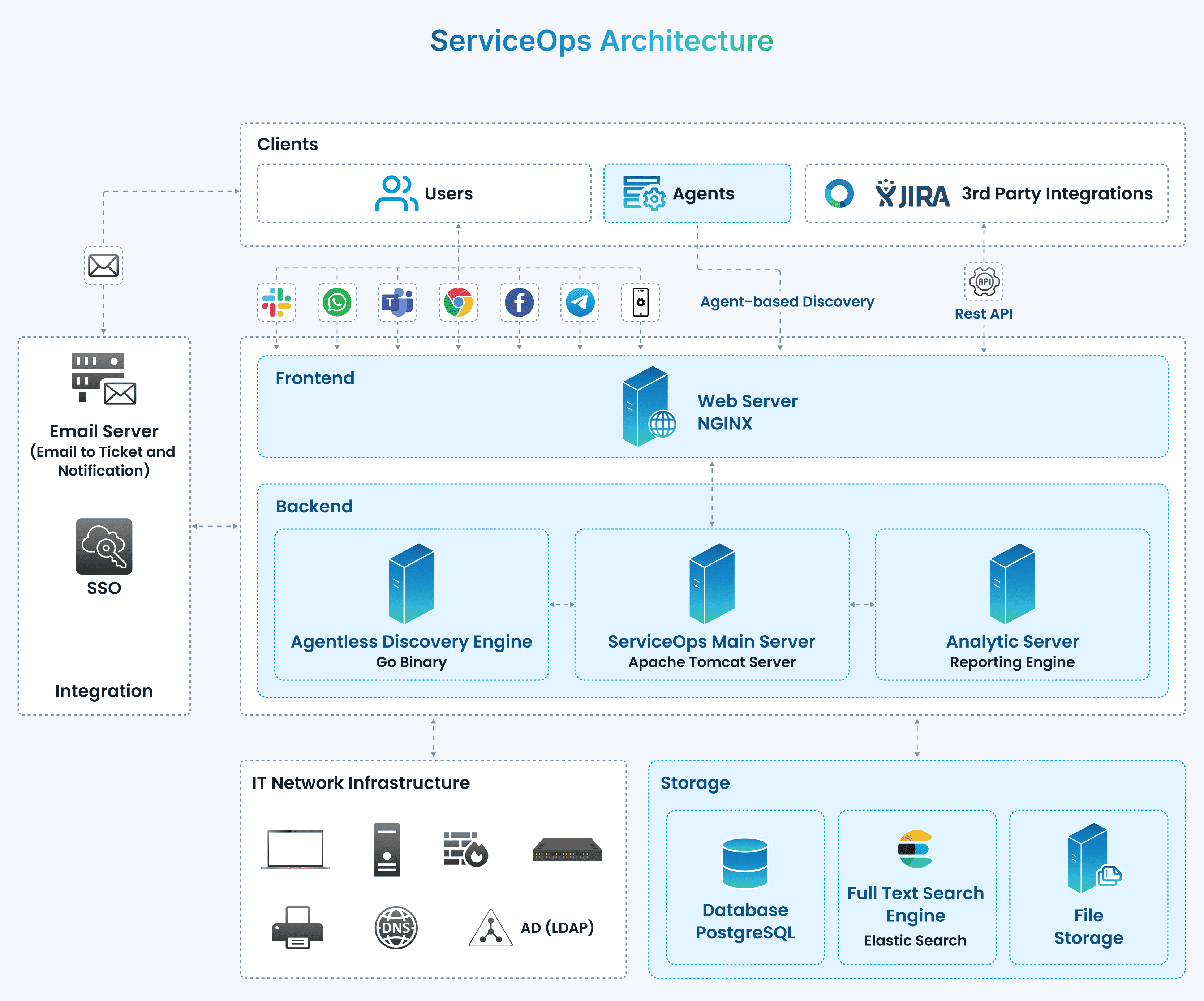 - Product Platform: The core layer that includes the ServiceOps Main Server, Agentless Discovery Engine, Analytic Server, Database, and Full-Text Search Engine.