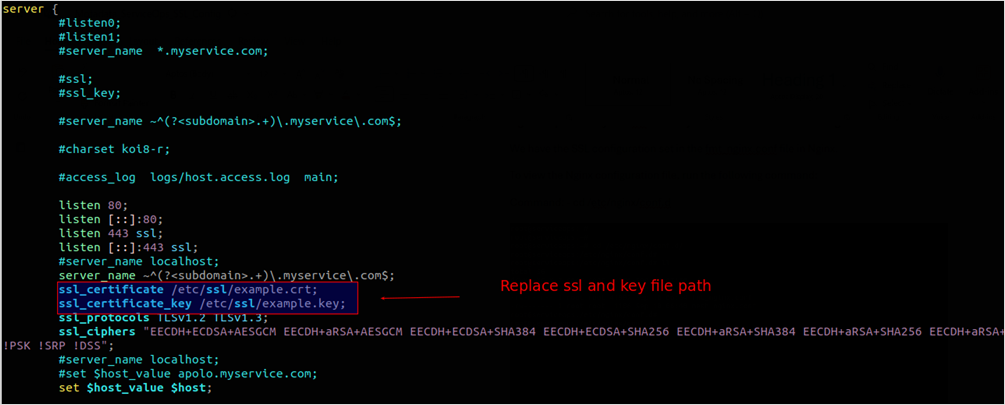 The above figure sets the SSL certificate path to /root/ssl on the server. The example.crt and example.key files are located at /root/ssl.