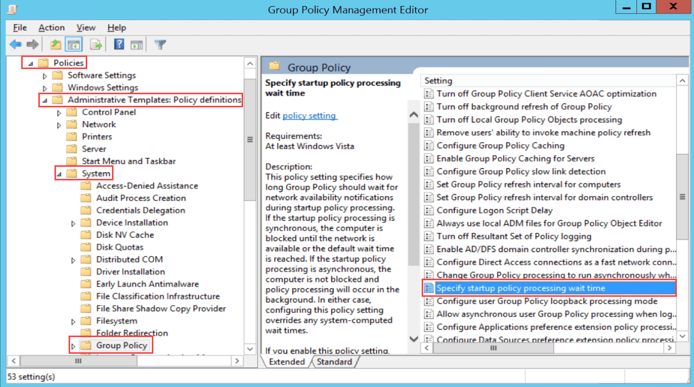 - Enable the option Specify startup policy processing wait time