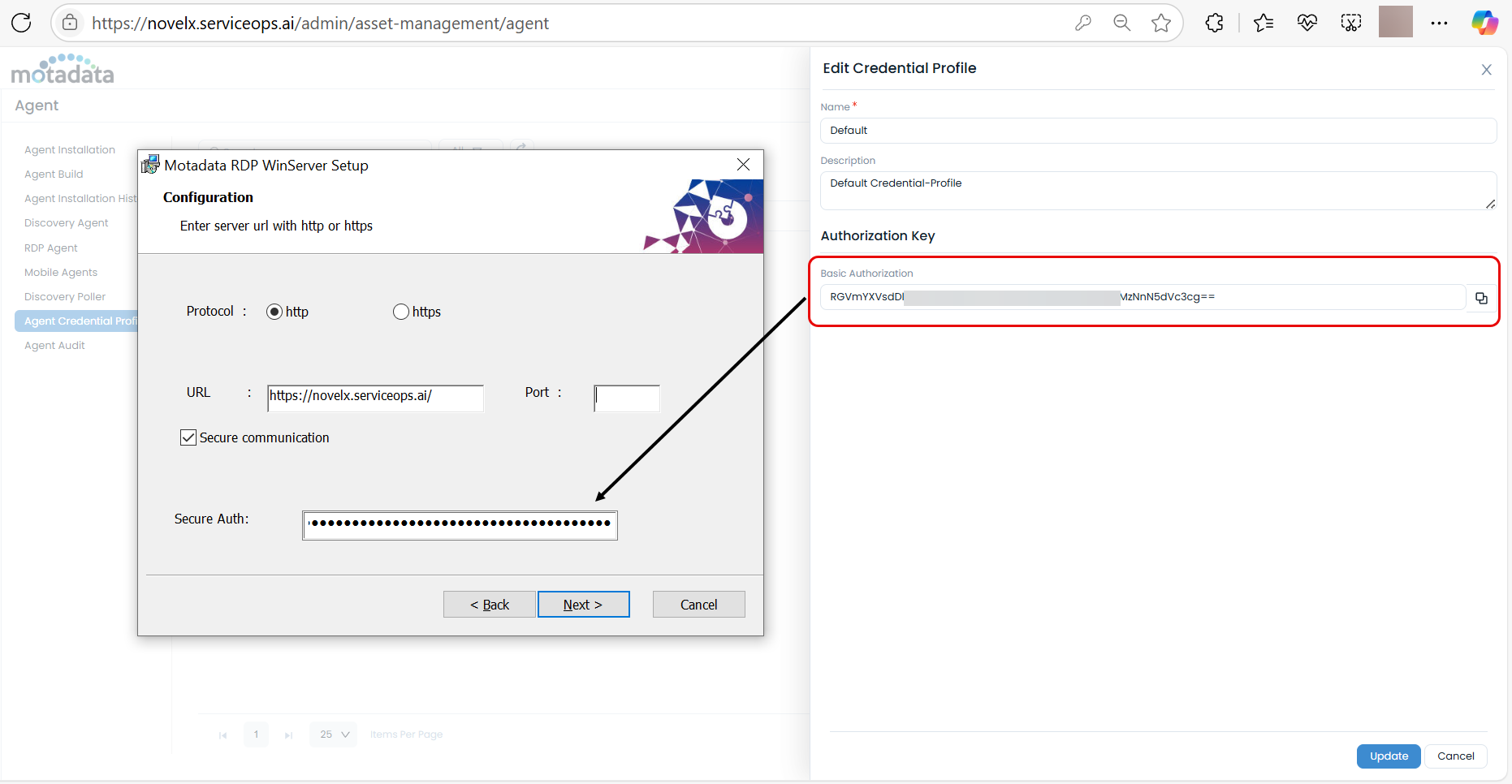 - Secure Communication: Enter the Secure Auth key from Agent Credential Profile