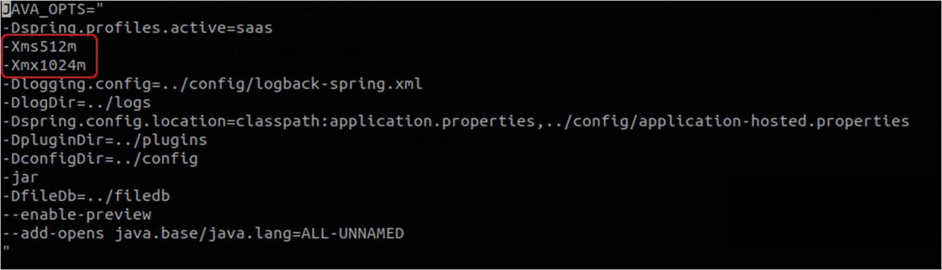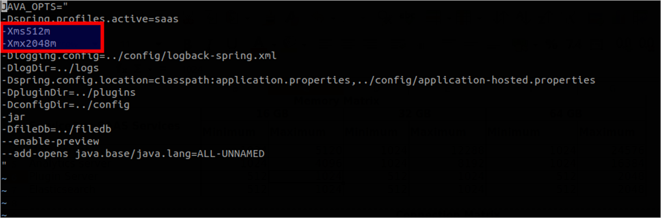 -Xmsand-Xmxand update the values based on your server capacity. For a 64GB server, you might use:-Xms512m -Xmx2048m