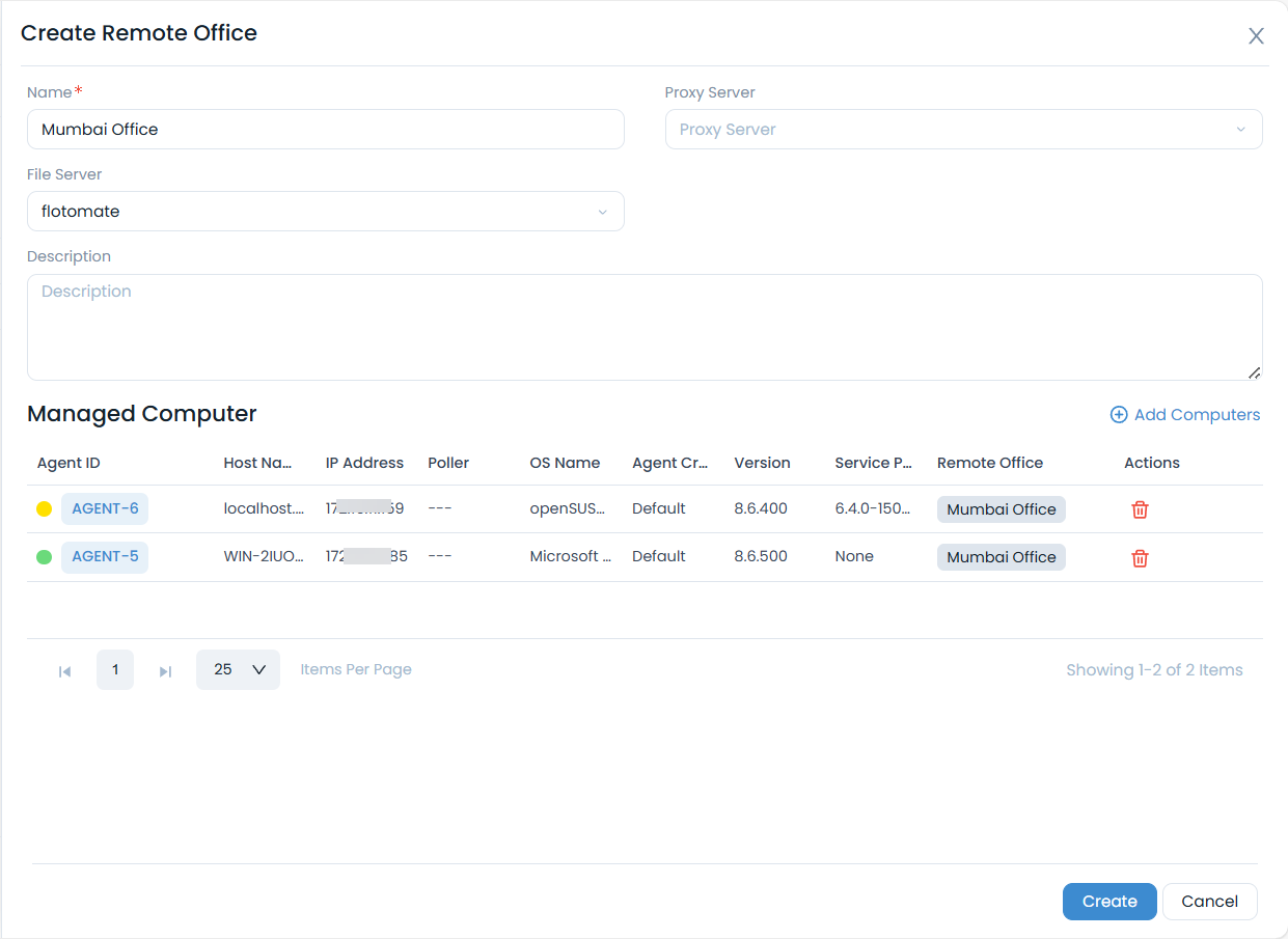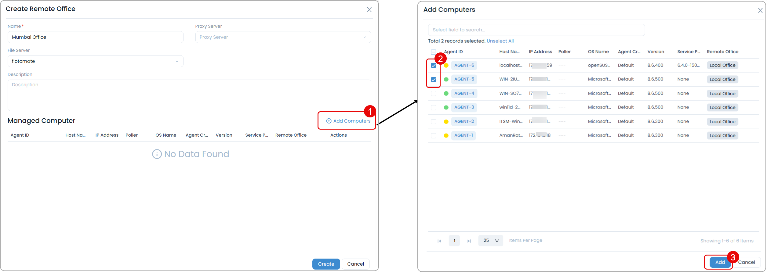 - Add Computers: Add computers to the remote office using the Add Computers link as shown below. A list of Agents appear, select the desired agents, and click Add.