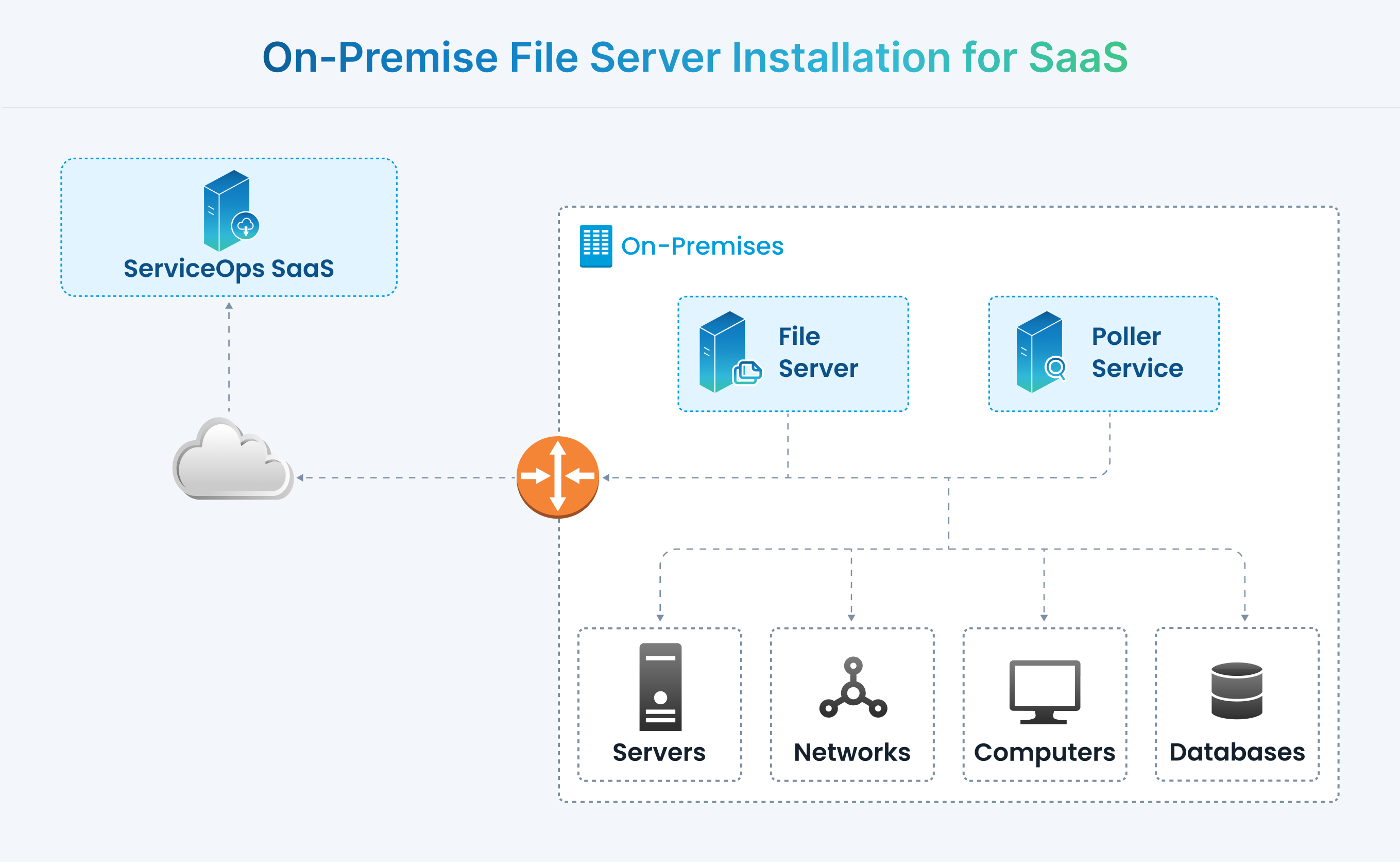 - Connectivity: Bidirectional connectivity between the File Server and the ServiceOps SaaS instance.