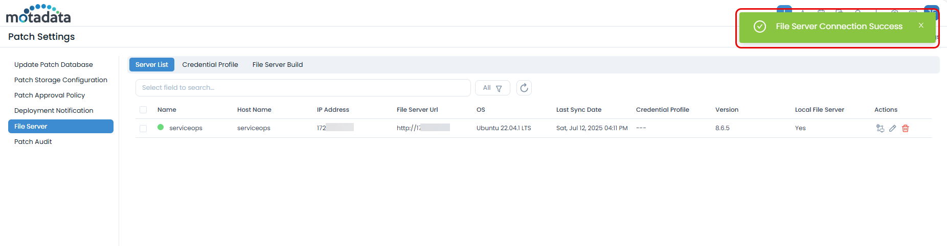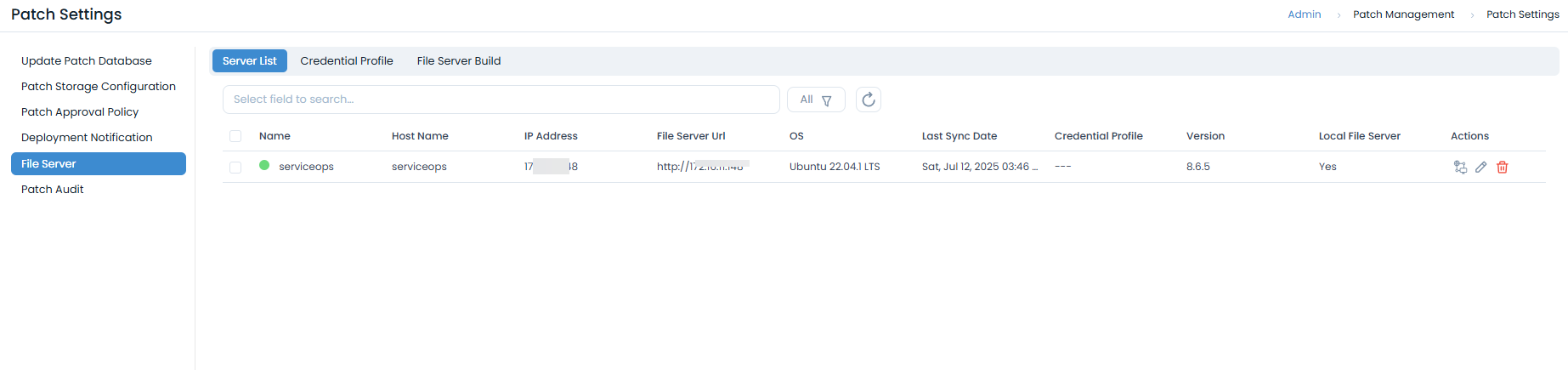 Verify Registration: In your SaaS portal, navigate to Admin > Patch Management > Patch Administration > File Server> Server List and confirm your server appears in the list.