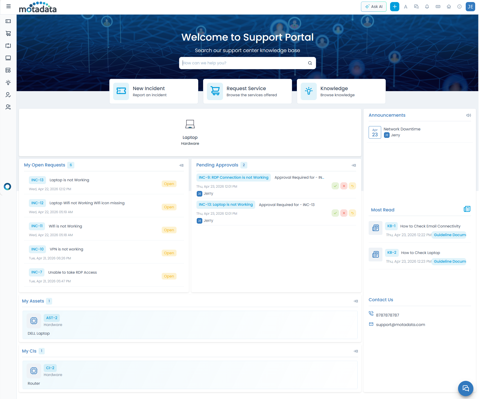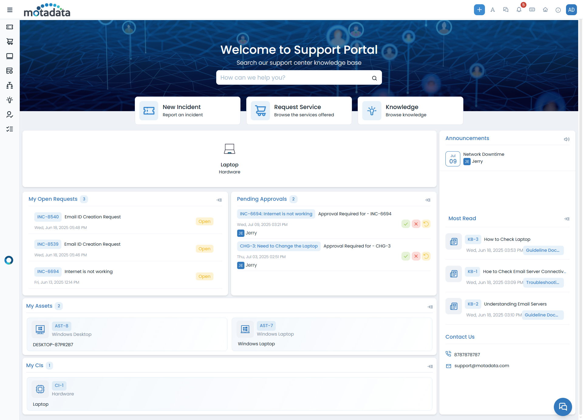 Welcome to the Support Portal, your centralized hub for IT assistance and services. Seamlessly report issues, request new services, and track your ongoing support tickets with ease, all through a user-friendly interface designed to connect you directly with your IT team.