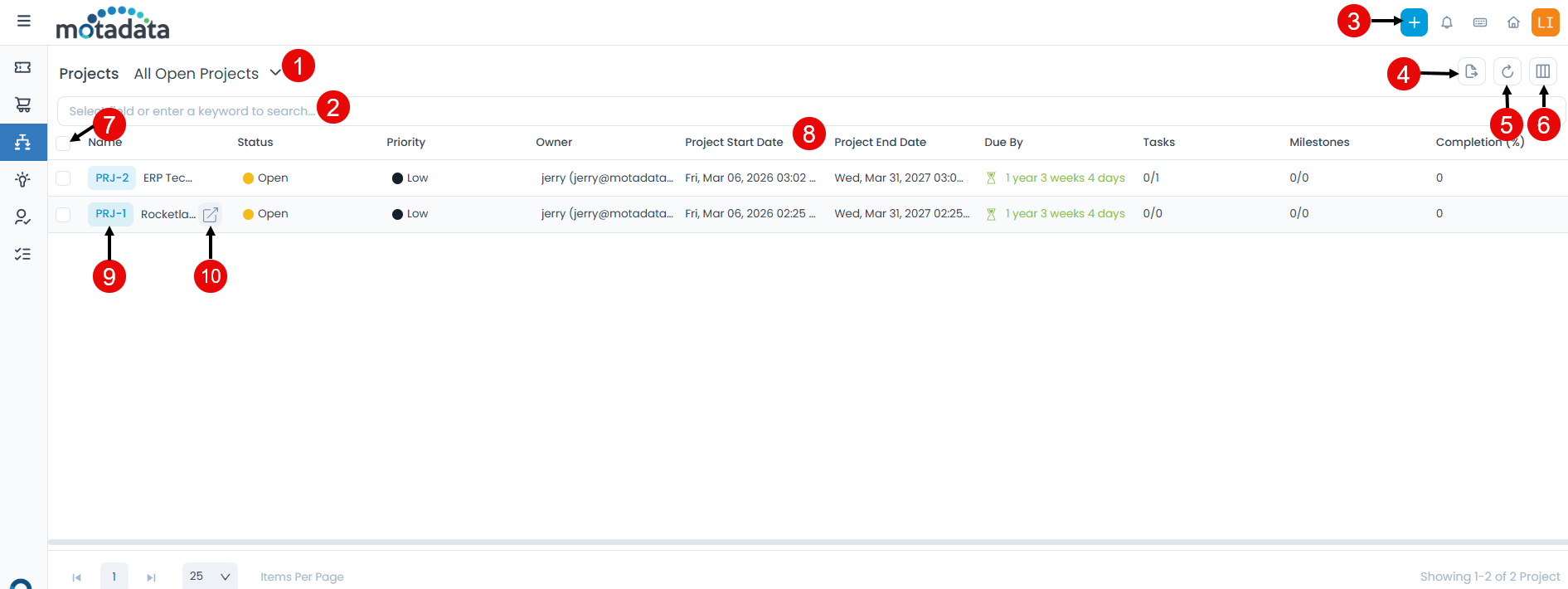 All Open Projects,My Open Projects, or other predefined views.Search Bar: Enter keywords or select fields to quickly find specific projects.
