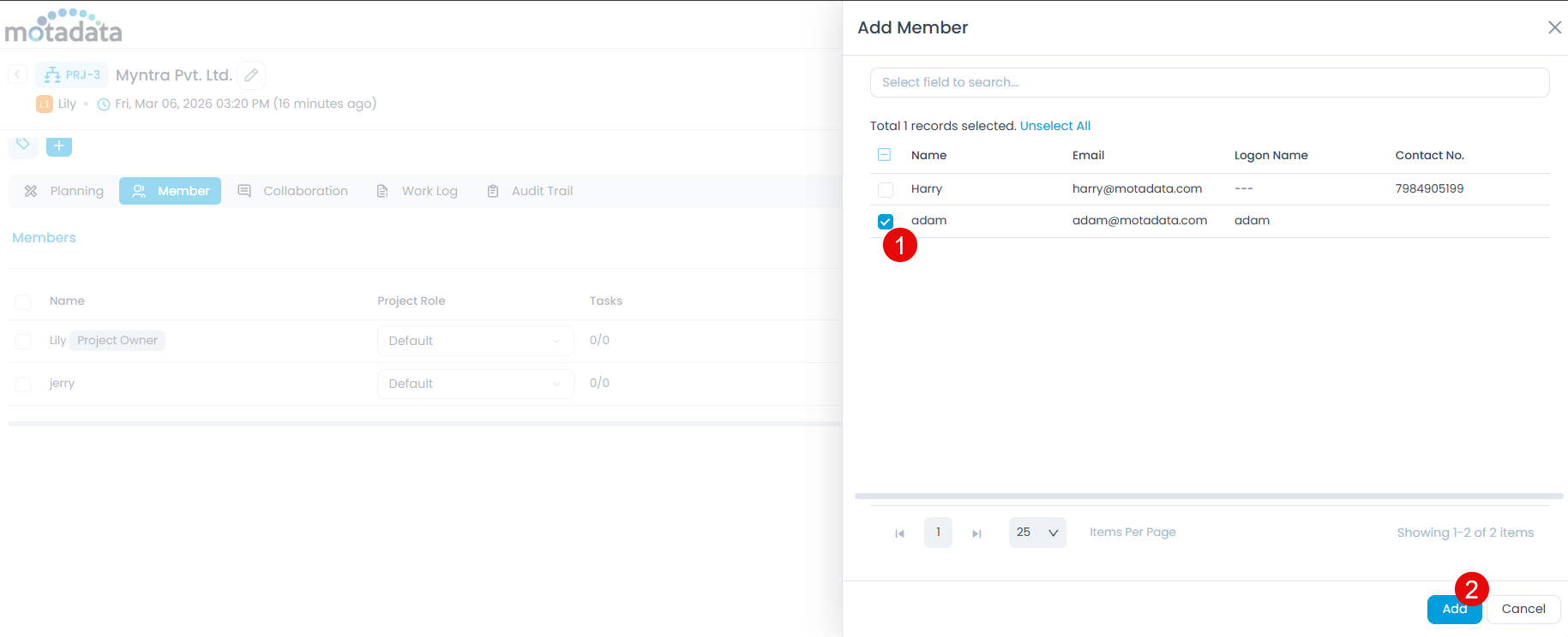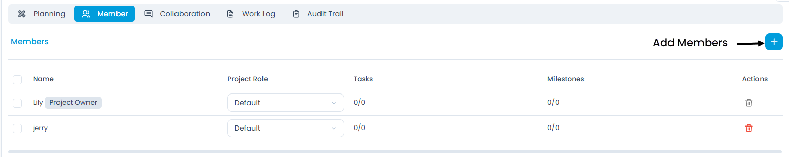 - The members will now appear in the project member list. Assign the project role to the members from the dropdown list.