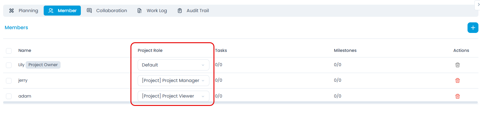 The project role determines what actions a member can perform within a project. Ensure roles are assigned appropriately based on member responsibilities.