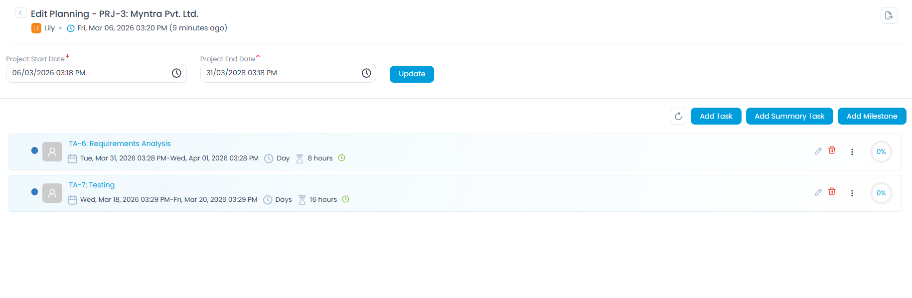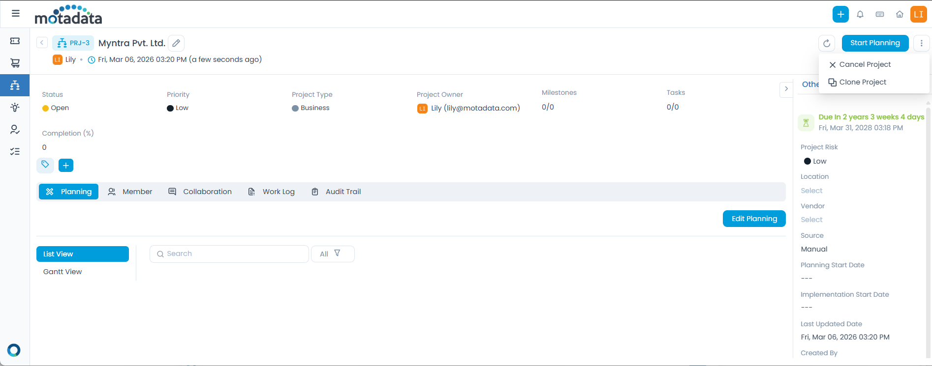 Before starting planning, a project owner must be assigned. Only assigned members can participate in project planning.