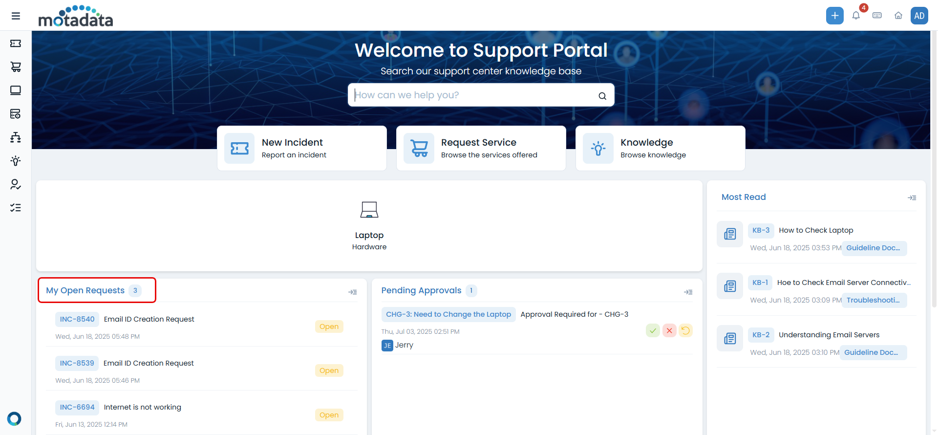 The Support Portal provides comprehensive tools for managing your requests throughout their lifecycle. Whether you're reporting an incident, requesting a service, or tracking the progress of your existing requests, the portal offers an intuitive interface to stay connected with your IT support team.