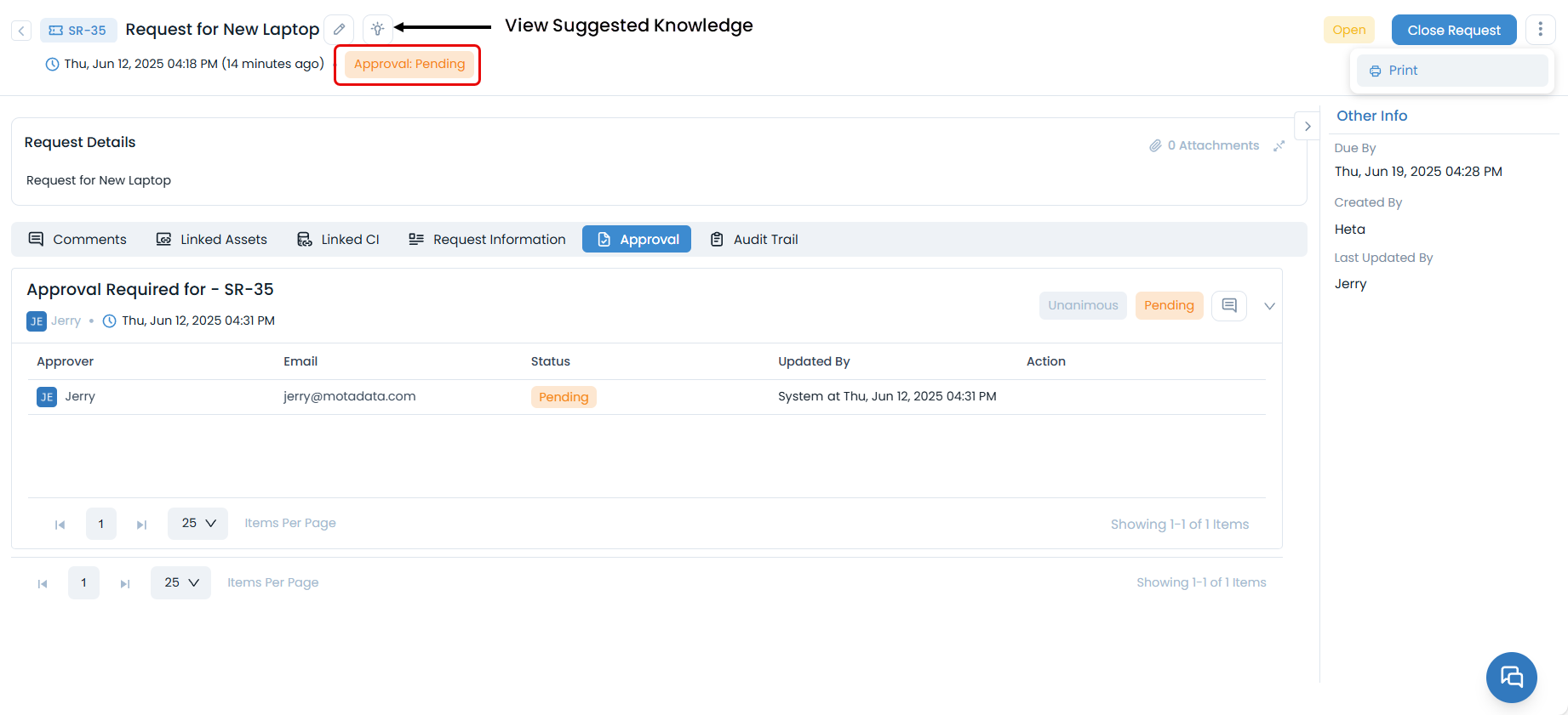 - Approval Status: Displays the status of the request.