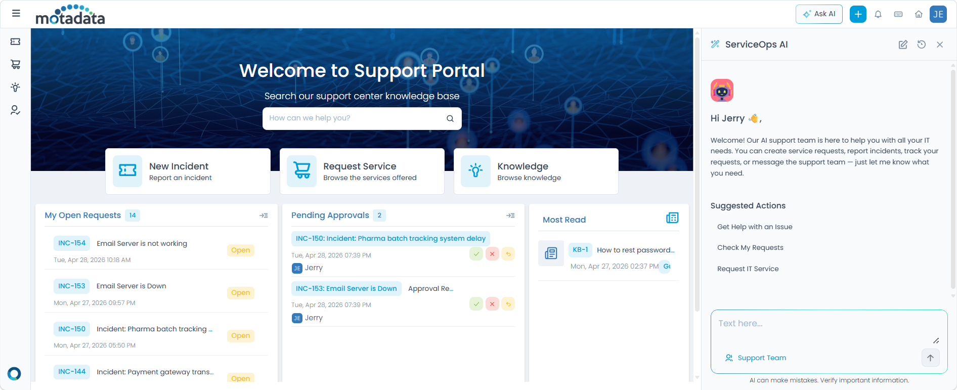 The Ask AI feature brings AI-powered assistance directly into the Support Portal. Instead of searching through the knowledge base or navigating menus manually, you can describe what you need in plain language and get immediate, intelligent guidance. Whether you need to raise a new request, check the status of an existing ticket, or find the right team to contact, the AI Assistant helps you get there faster.
