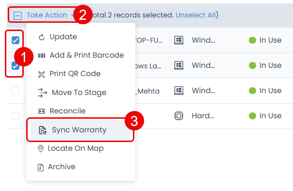 With bulk operations, you can manage multiple assets together. To do so, select the asset/s (1), click Take Action dropdown (2), and a list of actions appears (3).