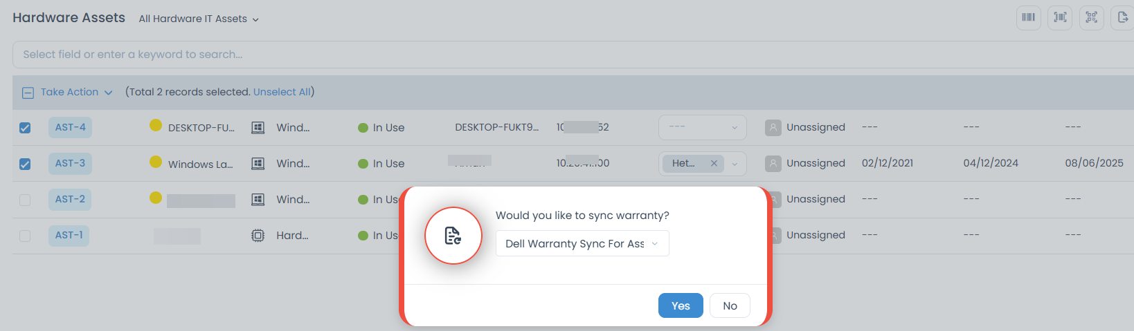 - Select the option Sync Warranty. A dialog box appears. Select the desired Warranty Sync configuration and click Yes to begin the process.