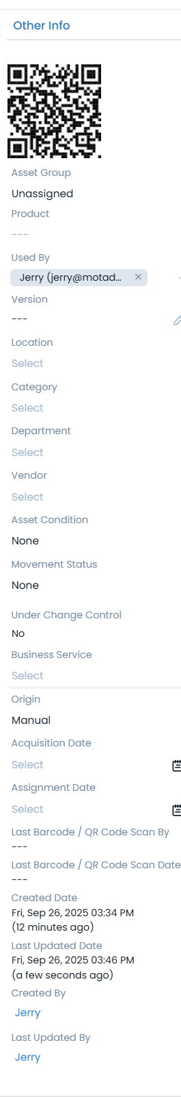 - QR Code: Shows the QR code of the asset.