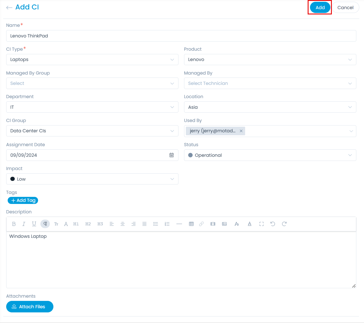 | Attachments | Attach any required documents or proofs along with the addition of the CI. Once attached, you can preview or even delete it using the respective icons. |