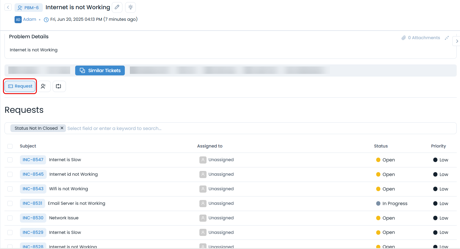 This tab displays the similar requests, problems, and change requests based on the AI similarity configuration. Here, Similar Requests are displayed.