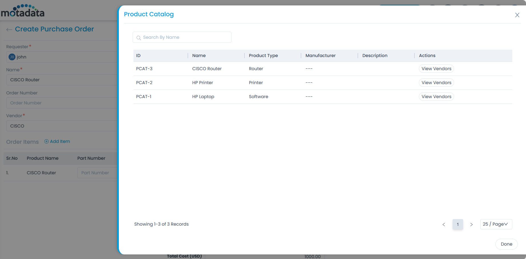- Vendor: Select the vendor from the dropdown list. You can add them from the Vendor Catalog page. You can also view the Product Catalog details by clicking on the Info icon.