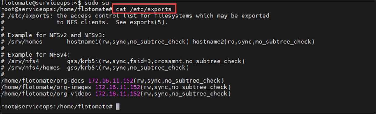 Example: /home/flotomate/org-docs 172.16.11.152(rw,sync,no_subtree_check)