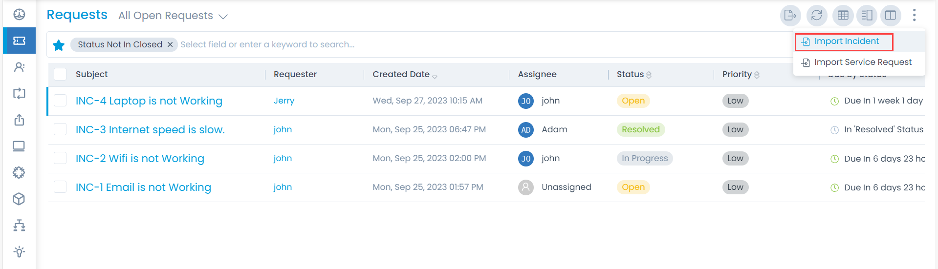 - In the ServiceOps Portal, navigate to the Request Management > Request List page. Click More Options and select Import Incident.