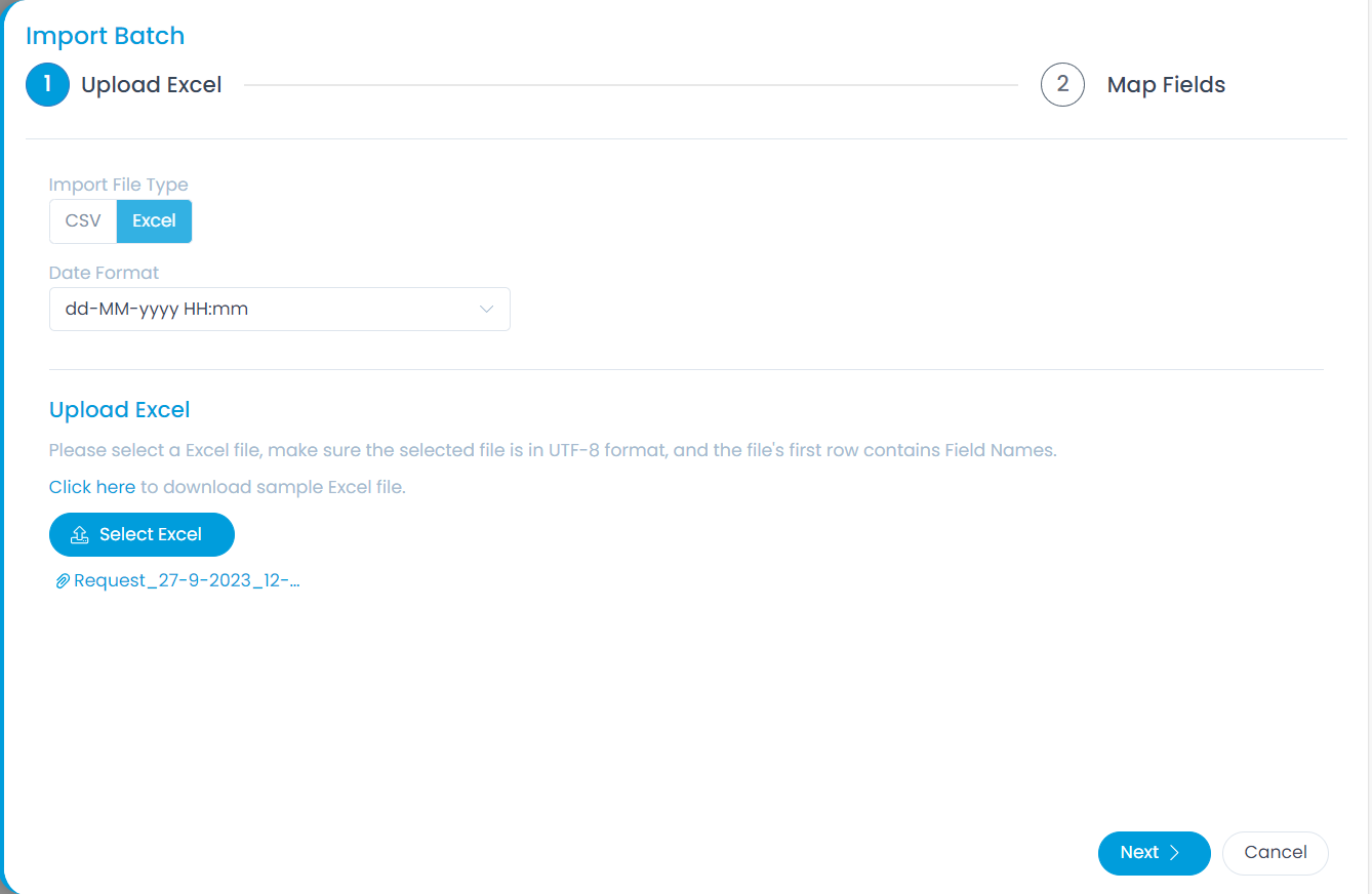 - Download the Sample Import file as per the file type selected. Once downloaded, enter the required details along with the location of the file to be imported in the Attachments column.