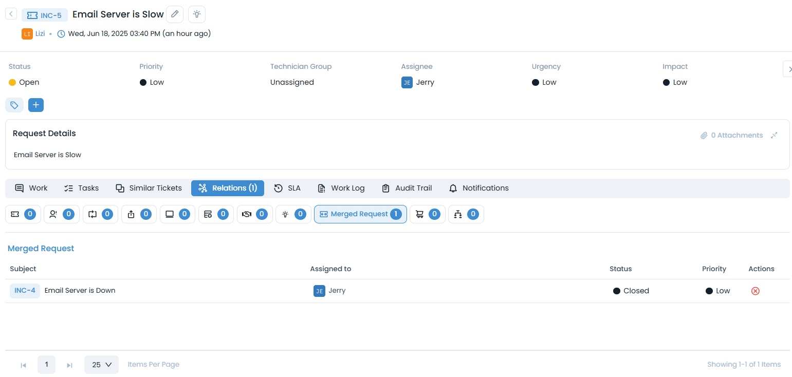 In the Merge process, one request is considered as the Primary Request, and all others as Secondary. As a result, the secondary requests link to the primary request. Also, the secondary requests will get closed once merged. Additionally, an email will be sent to the requester related to the request closed due to merging.