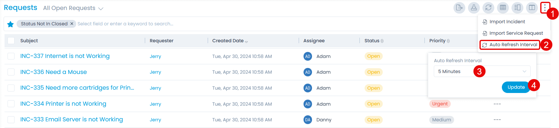 - Auto Refresh Interval: Apart from the manual refresh, you can set the time interval, after which the Technician Portal page will get refreshed automatically. Thus, you don't need to click the refresh button repeatedly. It applies to the Request, Problem, Change, Release, Asset (Hardware, Software, Non-IT, Consumable), and My Task modules. Once selected, set the time interval after which the page will get refreshed everytime, and click Update.