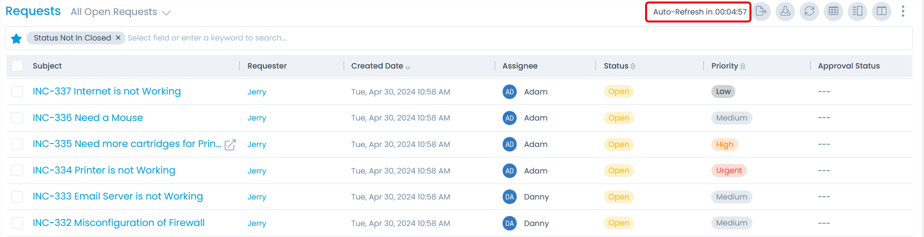 - Filter: You can filter the requests by clicking the desired option. For example: "If All Open Requests" is selected, the grid displays all the requests with open status.