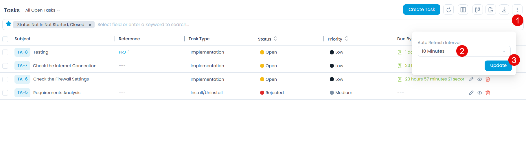 - Auto Refresh Interval: Apart from the manual refresh, you can set the time interval, after which the Technician Portal page will get refreshed automatically. Thus, you don't need to click the refresh button repeatedly. It applies to the Request, Problem, Change, Release, Asset (Hardware, Software, Non-IT, Consumable), and My Task modules. Once selected, set the time interval after which the page will get refreshed everytime, and click Update. The timer will be visible on the screen.