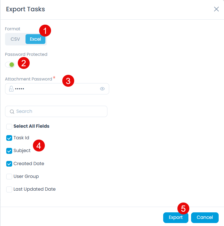- If Excel is selected, you can enable the Password Protected option to secure the file. If enabled enter the Attachment Password. If not provided, the common password set from Edit User Profile page will be used.