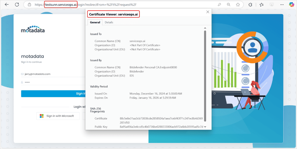 - Access the URL https://[domainurl]:8443/?serverkey=test (Replace domainurl with your URL) and check its certificate as shown below.